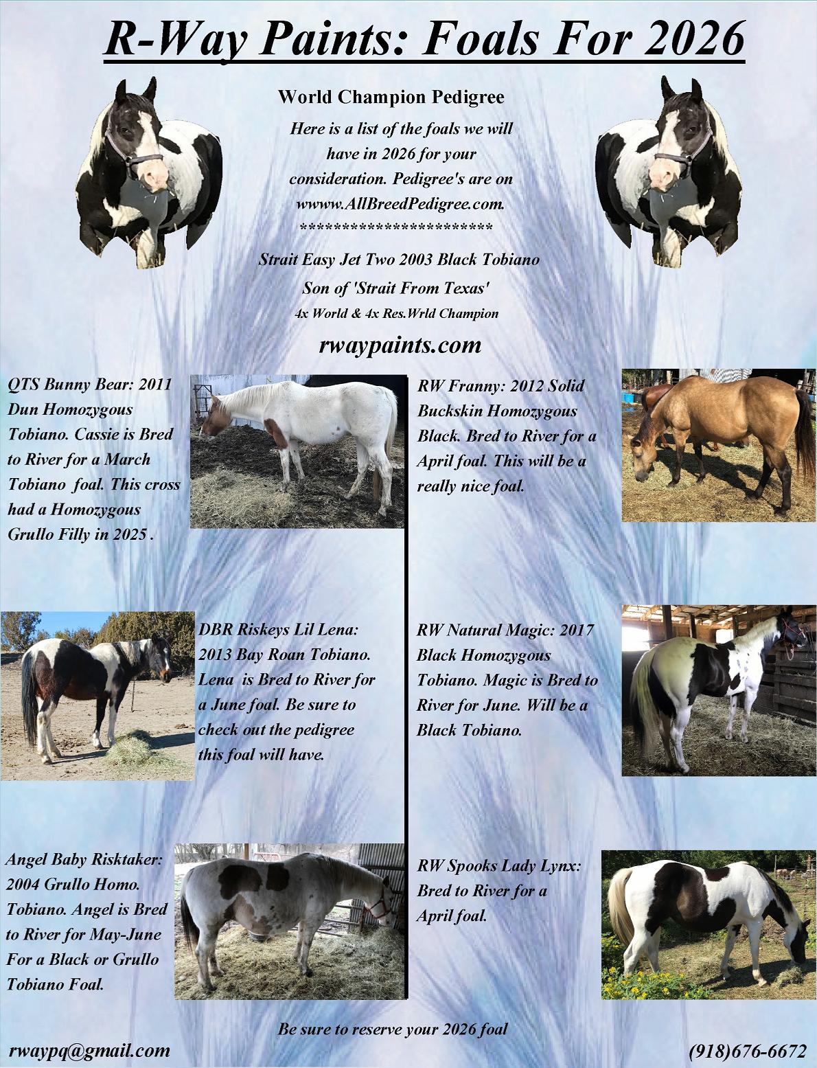 Listed below are the Mares I have bred for 2026. The first one will be due late March and last one June. They will all most likely be available. These are all proven mares and this will be a very nice foal crop.
